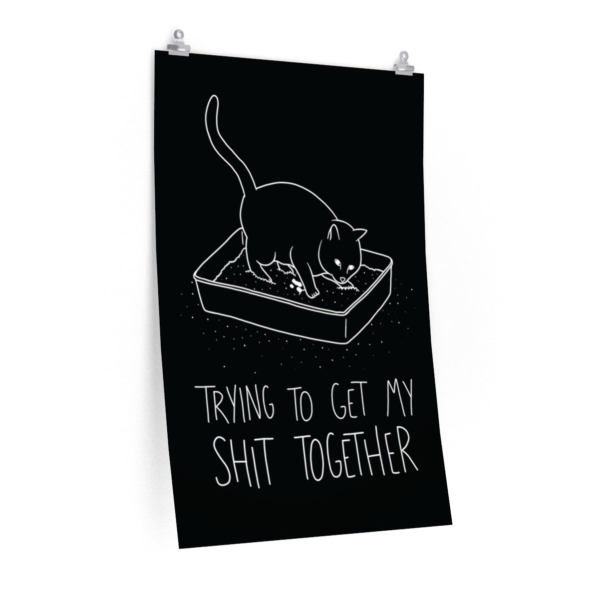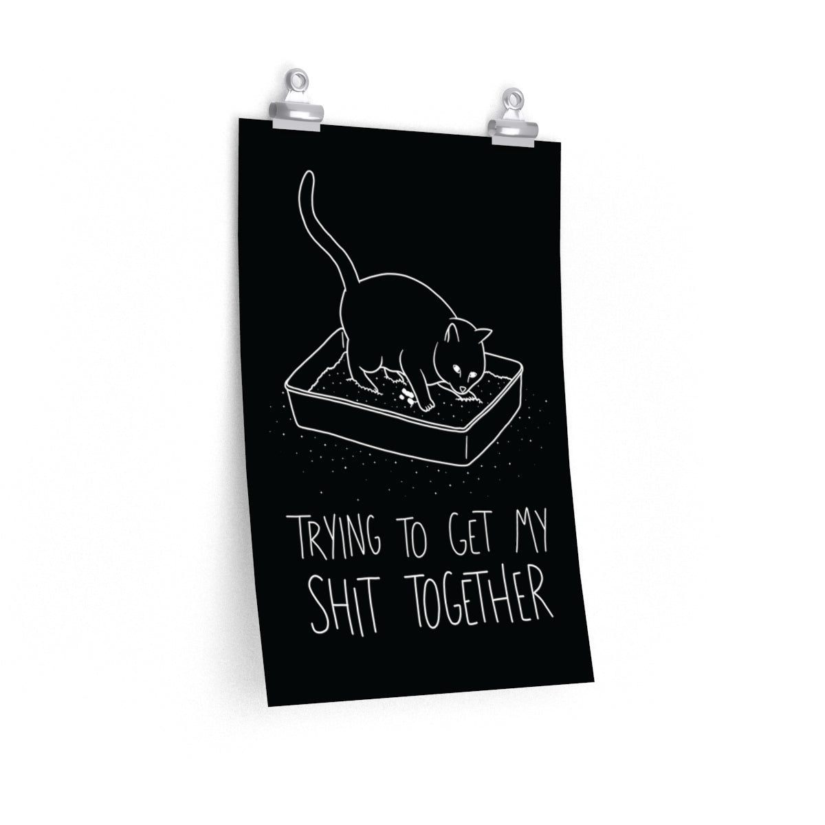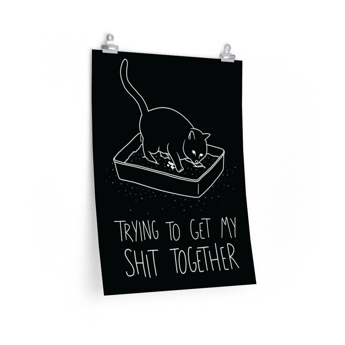 Add a bit of purr-sonality to your room with our Shit Together Cat Poster! Featuring a graphic print of a cat in the litter box and text that reads Trying to Get My Shit Together, this sassy cat poster is the purrfect way to add a bit of spice and personality to your room, be it dorm room or bedroom! Each Shit Together Cat Poster features gallery-quality print on natural white, matte archival paper; meaning your poster can be displayed without worries of fading or yellowing with age. Each black cat poster is printed with pigmented archival inks, guaranteeing a bright and illuminating print that will not fade due to sunlight exposure. Our Shit Together Cat Poster makes a purrfect statement piece for any room!
