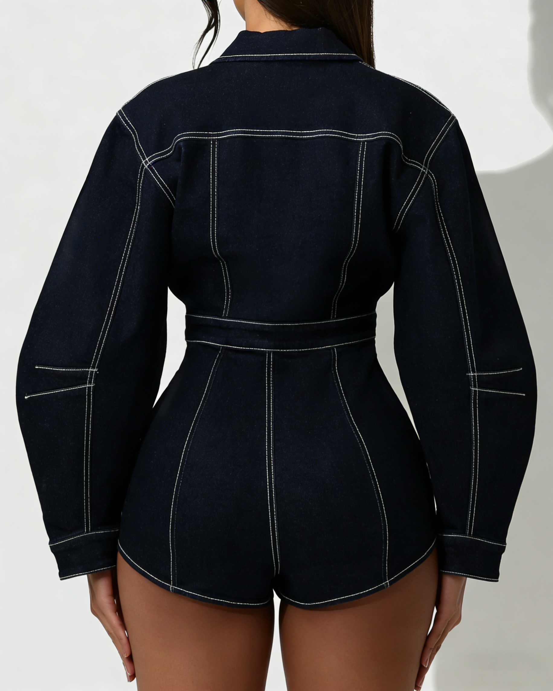 Crafted in a deep indigo wash, this denim romper is designed with sharp contrast stitching that defines every seam with the intentions to cinch the waist and deliver sculpting structure in all the right places. A front zipper closure and collared neckline nod to utilitarian styling, making this jean romper easy to dress up or keep it casual and minimal.