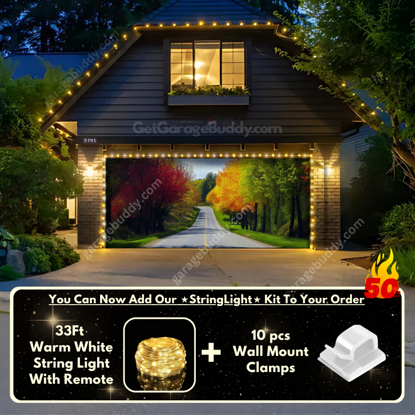 By request, we now offer the GarageBuddy string light kit at 50% off. While perfect for year-round use, it pairs beautifully with your Nature Garage Door Banner to add a gentle spring glow. The kit includes 1x 33ft warm white string light, a remote control, and 10x sticky wall mount clamps. The 2-door garage option comes with 2 string light kits. The lights work on three AA batteries (not included), so you don't need to run around finding electrical outlets.