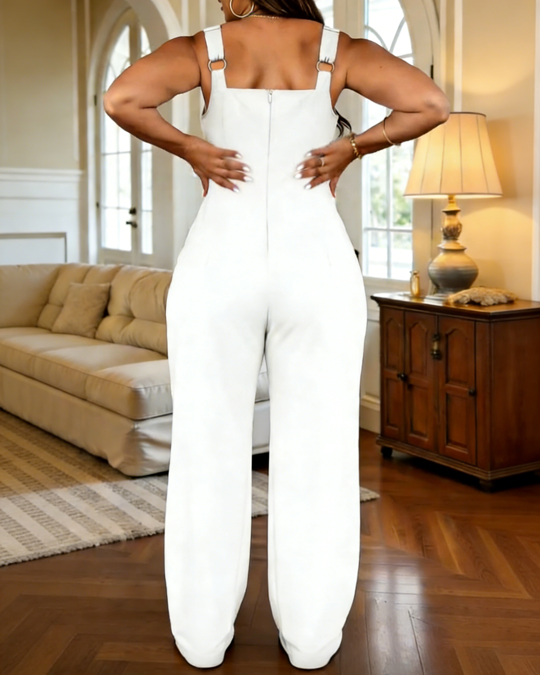 Jumpsuit Featuring A Square Collar, Sleeveless, Straight-Leg Design. Versatile Design For Casual Or Refined Styling. The silhouette is designed to flatter with an adjustable waistline, giving you the look you want no matter the occasion.