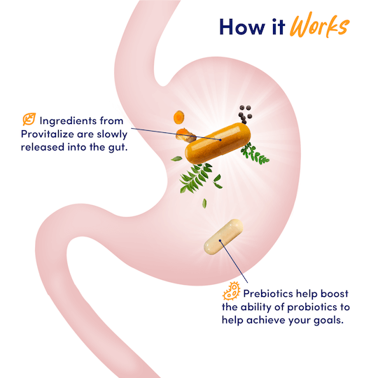 Previtalize is a super prebiotic blend. It works by “feeding” the probiotic strains found in Provitalize. As you may be aware, it takes 2-4 weeks for the probiotic strain to fully take root and germinate in the gut. By feeding it with prebiotic, they can enhance the impact of probiotics.