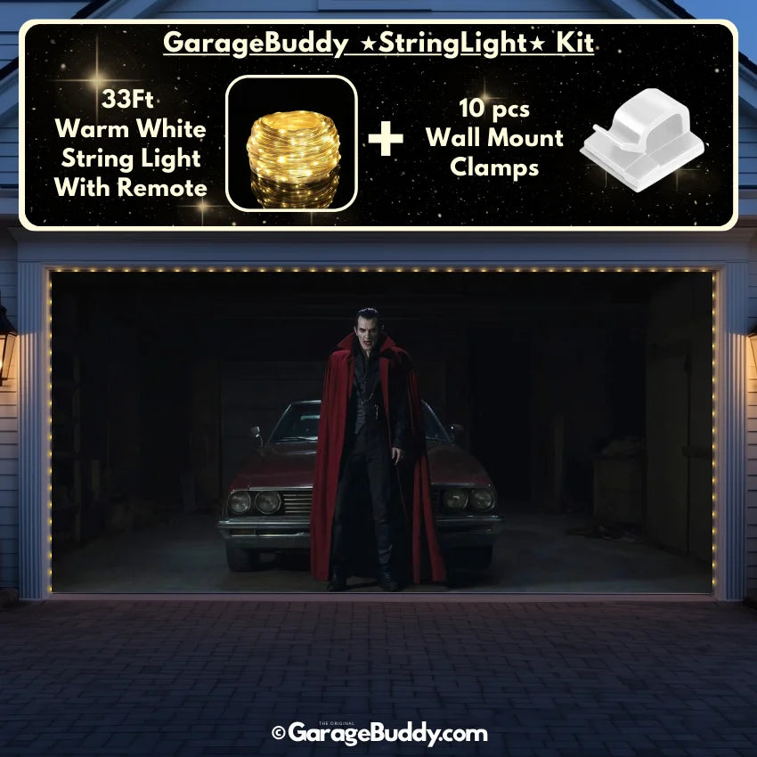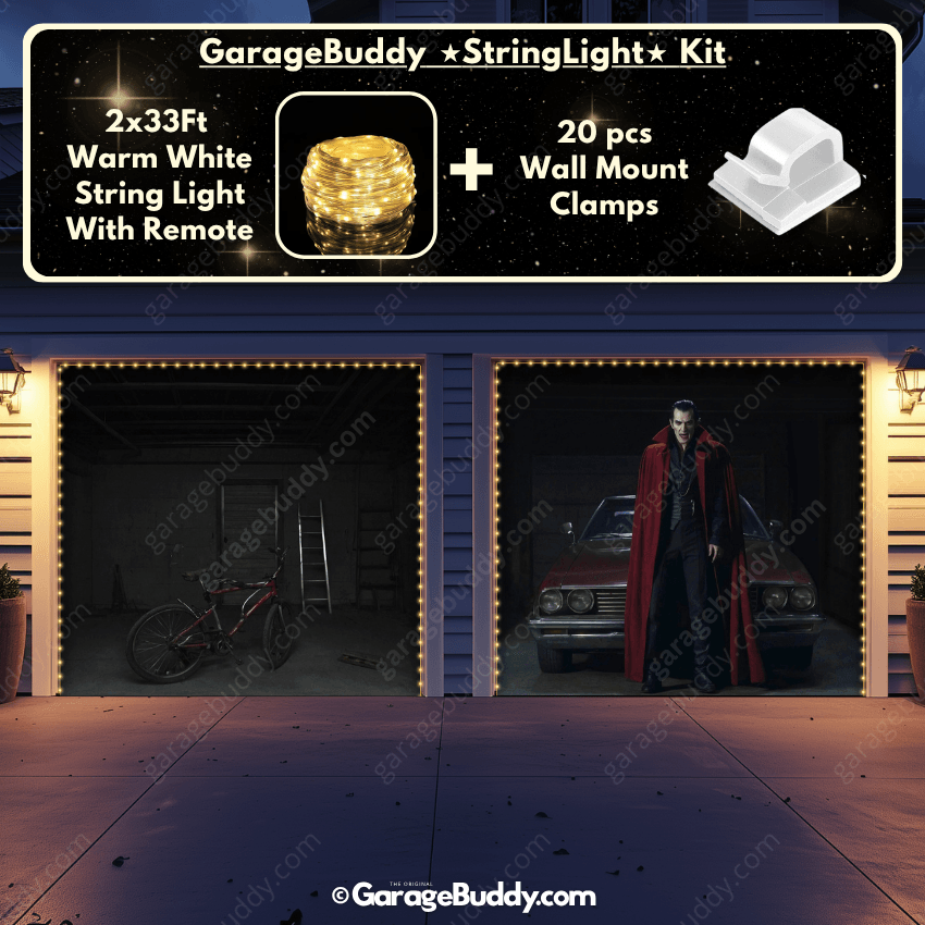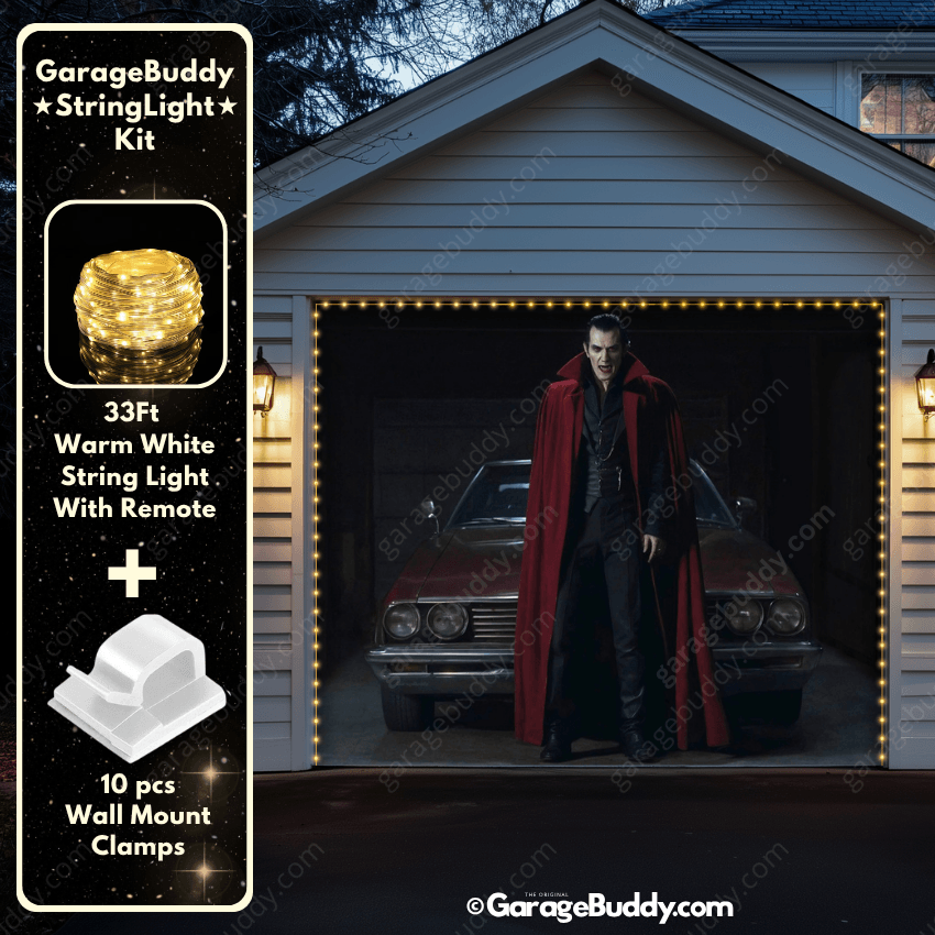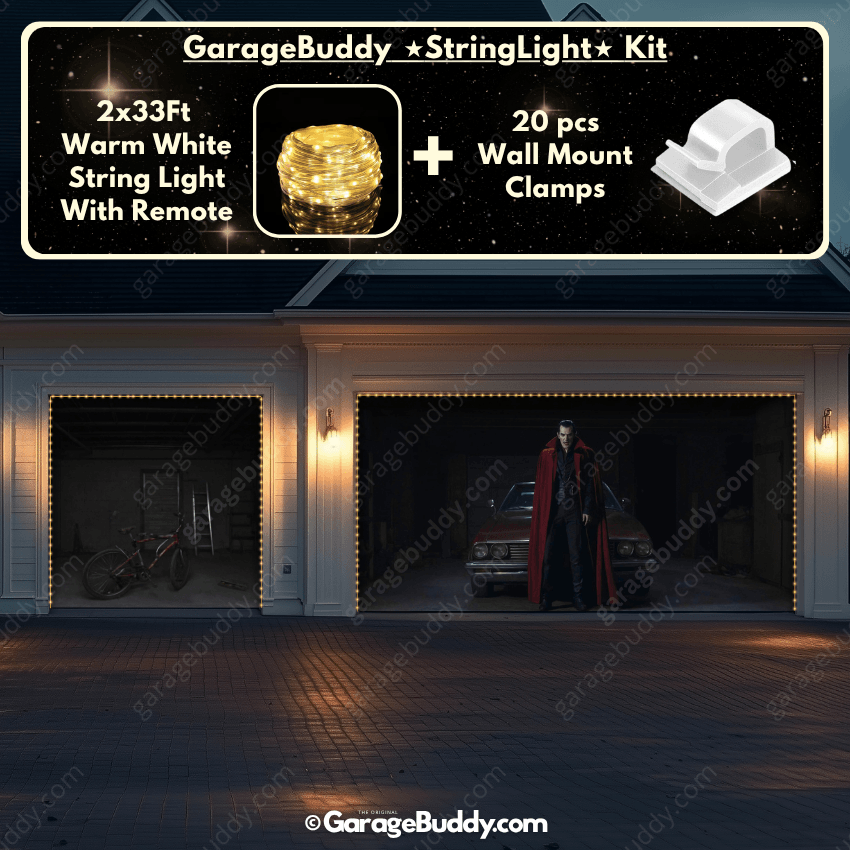 You now have the option to add the GarageBuddy string light kit to your order at 50% off and make the BloodSucker even more terrifying after dark. Pair your Halloween garage door cover with glowing string lights to amplify the eerie effect. The kit includes 1x 33 ft warm white string light, a remote control, and 10x sticky wall mount clamps. The 2-door garage option comes with 2 kits. The lights run on three AA batteries (not included), so you don’t need to scramble for outlets—making it the perfect upgrade for your creepy garage door cover.