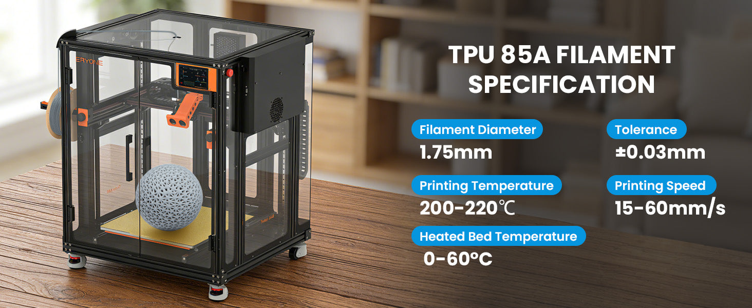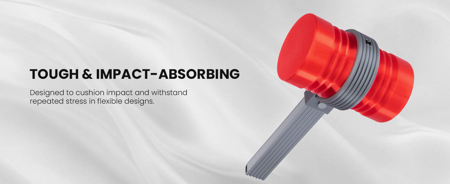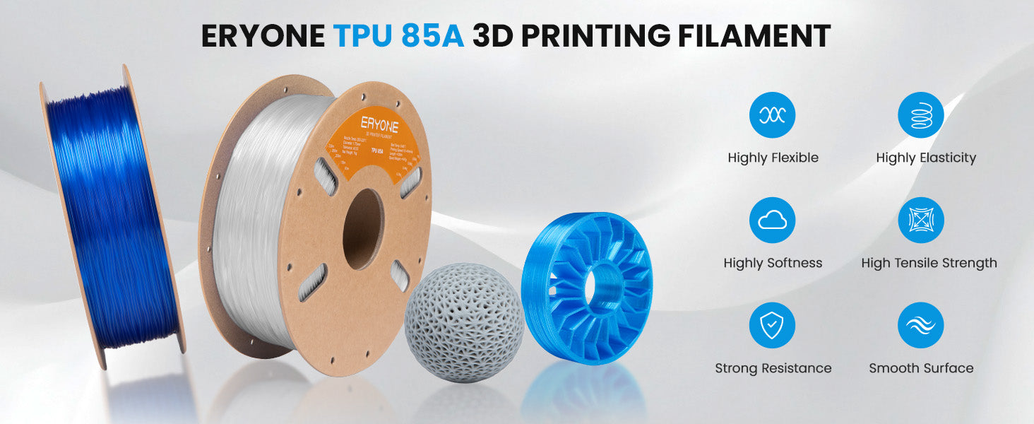 Our ERYONE TPU flexible filament is a thermoplastic polyurethane (TPU) based filament.The most notable property of this filament is its flexibility. Beyond its flexibility, TPU is also very durable and hard to break. It can absorb impact well, making it an ideal filament to use if you need a strong material.Its durability also extends to being able to withstand a variety of elements. This means that it is resistant to water, heat, oil.If you need to print something that has to be flexible, durable, or resilient, then TPU will be your best bet.