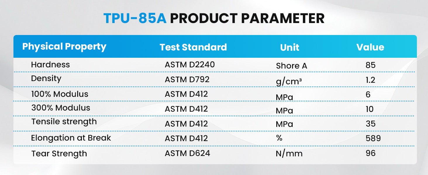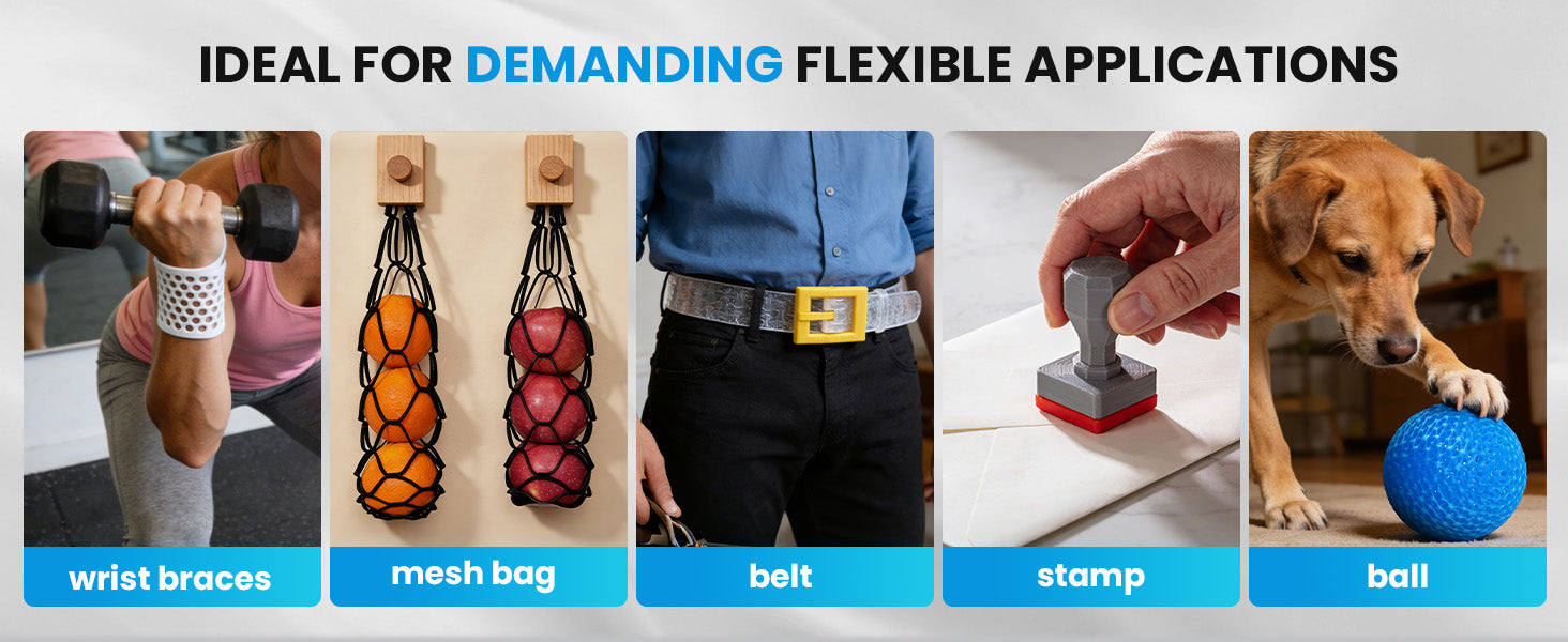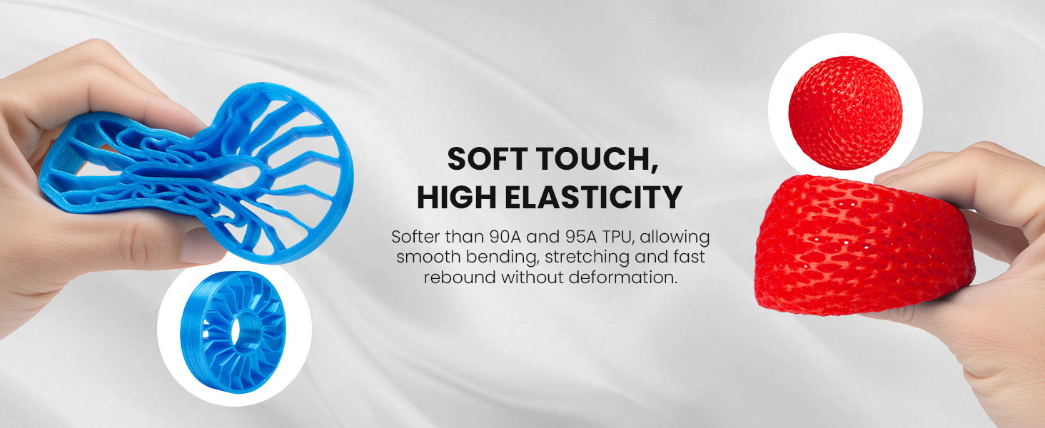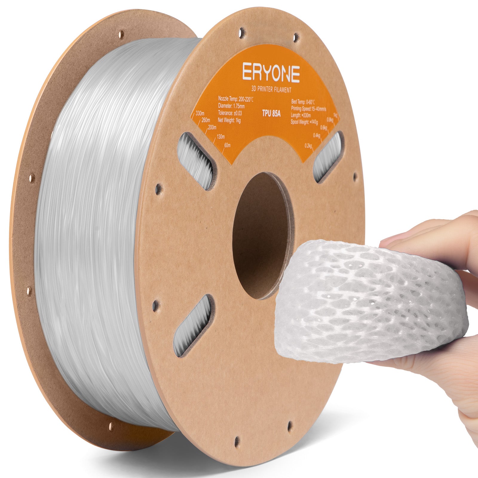 Our ERYONE TPU flexible filament is a thermoplastic polyurethane (TPU) based filament.The most notable property of this filament is its flexibility. Beyond its flexibility, TPU is also very durable and hard to break. It can absorb impact well, making it an ideal filament to use if you need a strong material.Its durability also extends to being able to withstand a variety of elements. This means that it is resistant to water, heat, oil.If you need to print something that has to be flexible, durable, or resilient, then TPU will be your best bet.