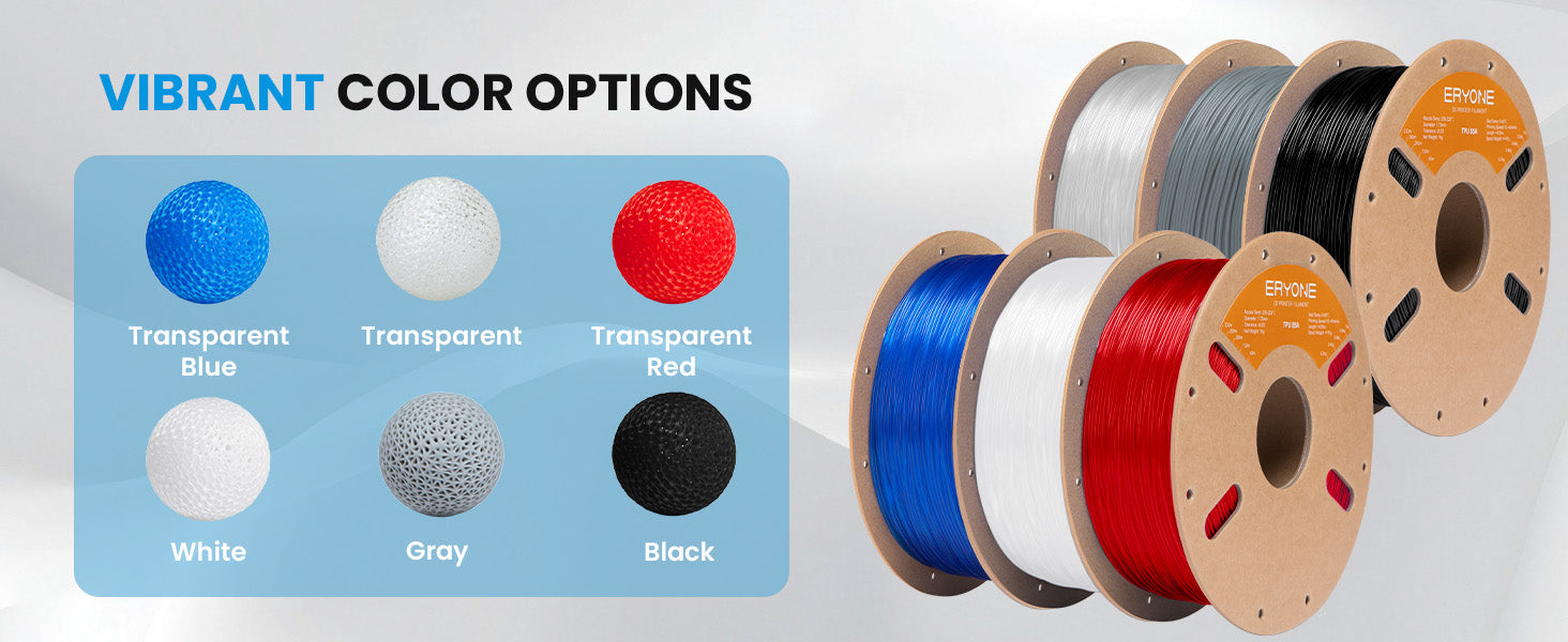 The (Bundle Sale)TPU 85A Flexible Filament - 1.75mm±0.03mm (1kg) is available in the following options: US / Solid black, US / Solid white, US / Gray, US / Transparent, US / Transparent Red, US / Transparent Blue, EU / Solid black, EU / Solid white, EU / Gray, EU / Transparent, EU / Transparent Red, EU / Transparent Blue, CA / Solid black, CA / Solid white, CA / Gray, CA / Transparent, CA / Transparent Red, CA / Transparent Blue, UK / Solid black, UK / Solid white, UK / Gray, UK / Transparent, UK / Transparent Red, UK / Transparent Blue, RU / Solid black, RU / Solid white, RU / Gray, RU / Transparent, RU / Transparent Red, RU / Transparent Blue. Check the product page for current stock availability.