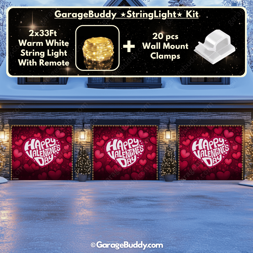 You now have the option to add the Garagebuddy string light kit to your order at 50% Off and turn your garage into a true winter wonderland. The kit includes 1x 33ft warm white string light, a remote control, and 10x sticky wall mount clamps. The 2-door garage option comes with 2 string light kits. The lights work on three AA batteries (not included), so you don't need to run around finding electrical outlets.