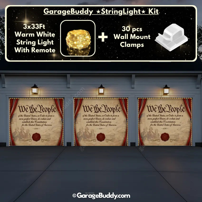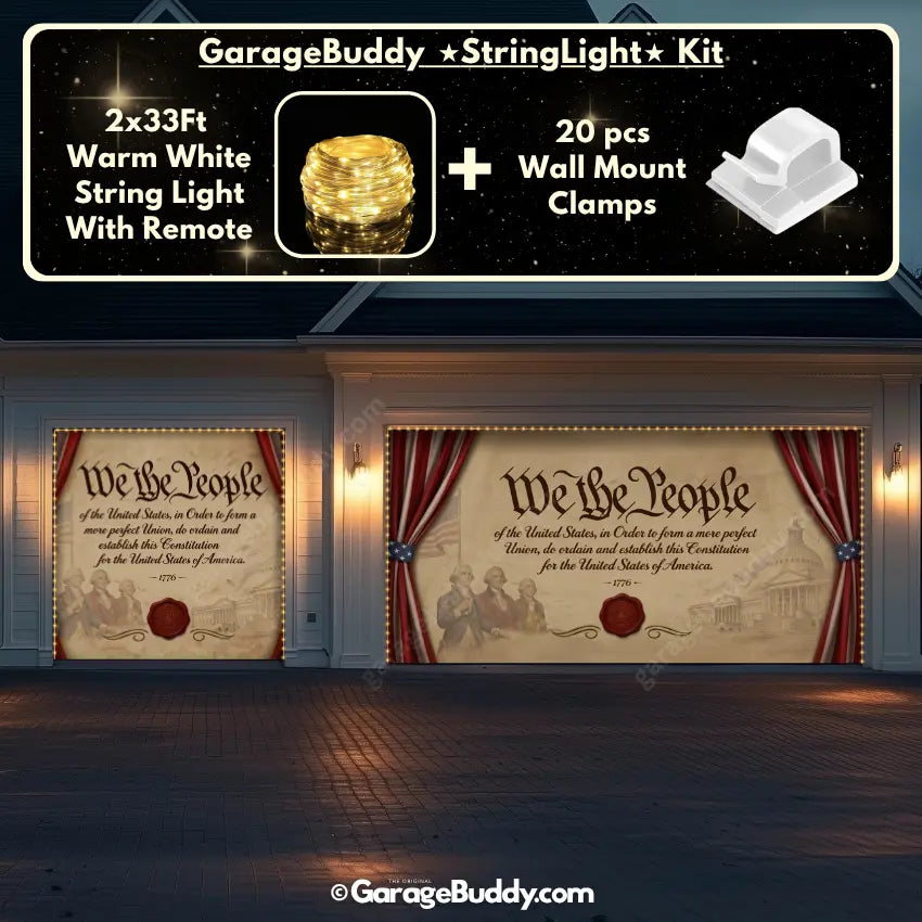 You now have an option to add the GarageBuddy string light kit to your order at 50% Off and turn your garage into a true winter wonderland. The kit includes 1x 33ft warm white string light, a remote control and 10x sticky wall mount clamps. The 2-Door garage option comes with 2 string light kits. The lights work on three AA batteries (not included), so you don't need to run around finding electrical outlets.Â